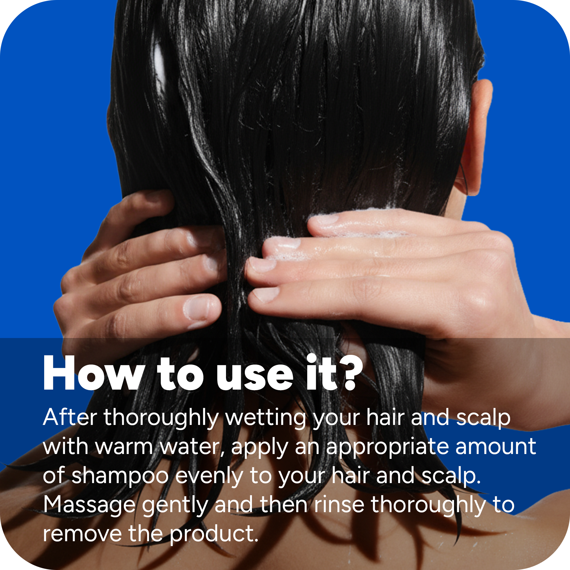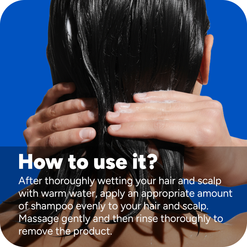 After thoroughly wetting your hair and scalp with warm water, apply an appropriate amount of shampoo evenly to your hair and scalp. Massage gently and then rinse thoroughly to remove the product.